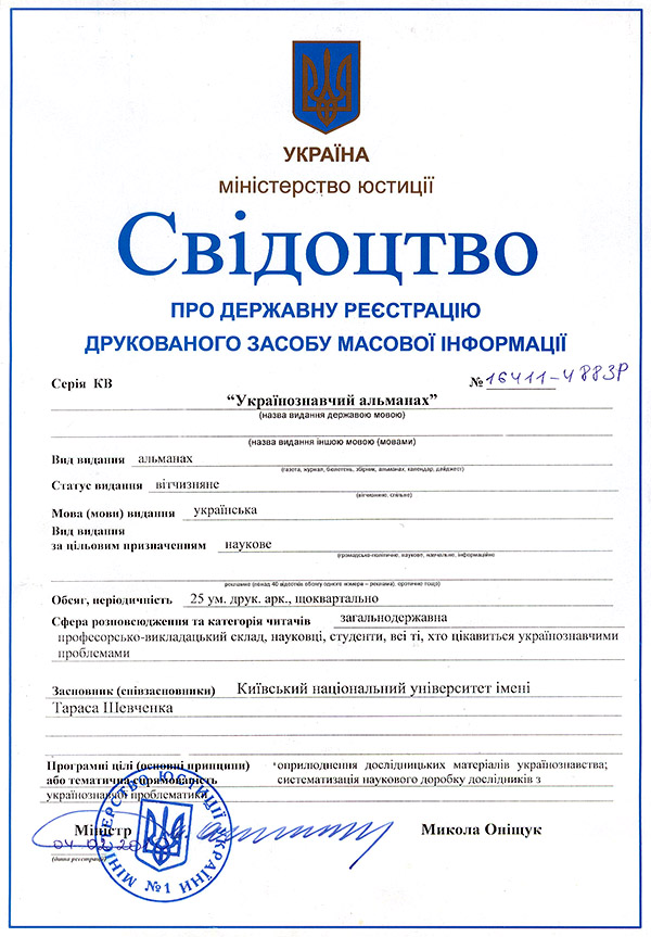 Зареєстровано Міністерством інформації України. Свідоцтво про державну реєстрацію КВ № 16411–4883Р від 04.02.2010